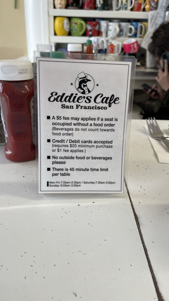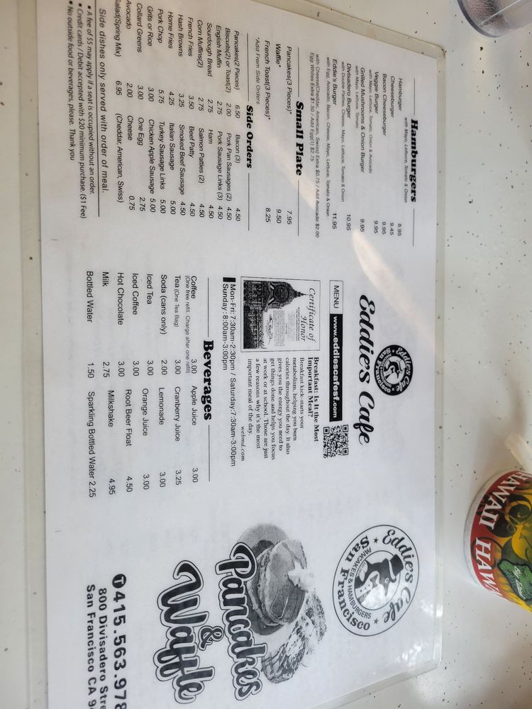 Introducing the menu at Eddie's Cafe located at 800 Divisadero St, San Francisco, CA. This casual eatery offers a variety of popular options including waffles, burgers, and breakfast/brunch dishes. Diners can enjoy the convenience of delivery, takeout, and reservations, along with many vegetarian choices. The restaurant is wheelchair accessible and accepts credit cards, Android Pay, and Apple Pay. Outdoor seating is available, making it a great spot for groups and families. Eddie's Cafe provides a welcoming atmosphere with gender-neutral restrooms and is open to all. Happy hour and alcohol options are offered, catering to different tastes. With a cozy diner feel and friendly staff, Eddie's Cafe is a must-visit for a hearty breakfast or brunch experience.